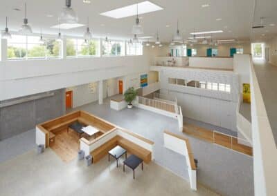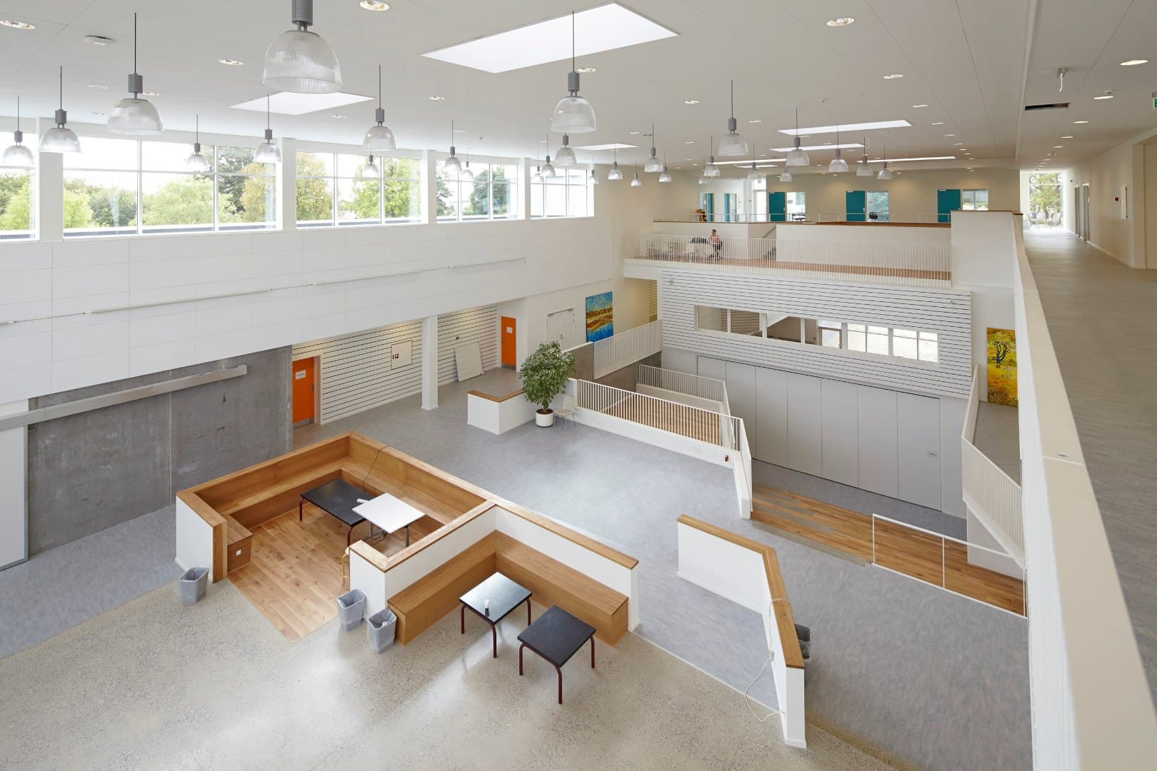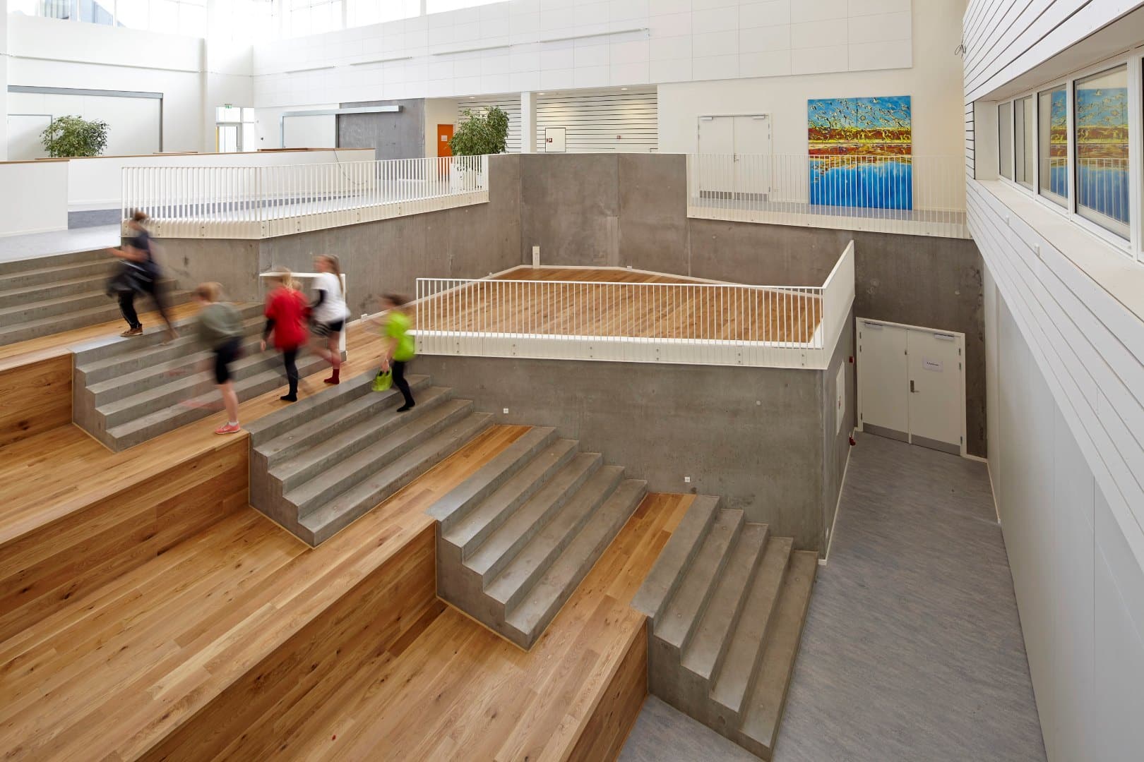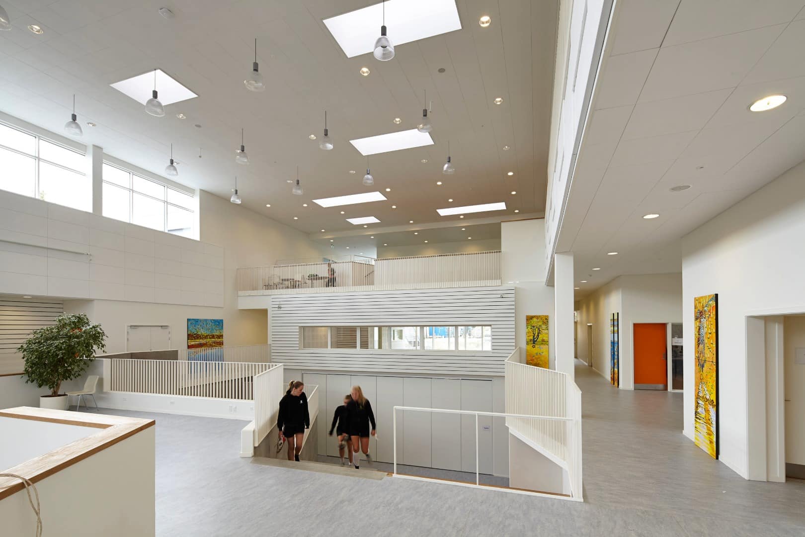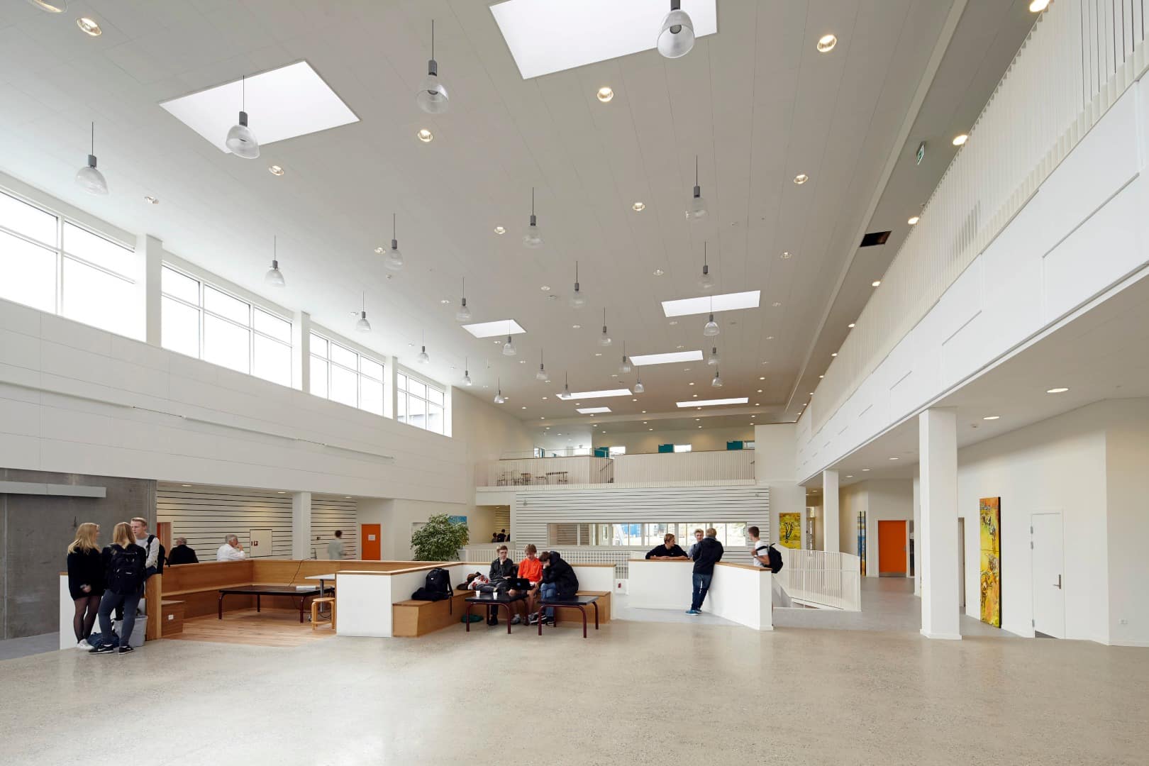 Den nye bygningsdel rummer naturvidenskabelige undervisningsfaciliteter, en multisal med tilhørende fitnessrum, specialindrettede musiklokaler samt et kreativt torv og en atriumgård, der fungerer som lærings- og opholdsrum for skolens elever. Indretningen er præget af store, lyse fællesarealer og markante arkitektoniske greb, herunder åbne trapper, fleksible zoner og direkte adgang til et udendørs amfiområde, som skaber naturlige rammer for både undervisning og sociale aktiviteter. Den samlede løsning udstråler et moderne og imødekommende gymnasiemiljø, der understøtter varierede undervisningsformer og styrker skolens daglige liv.